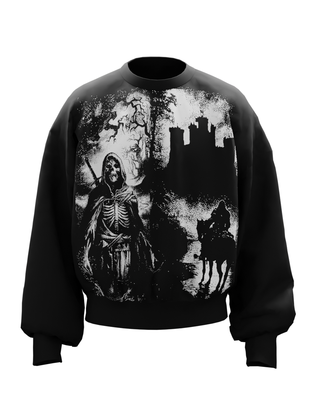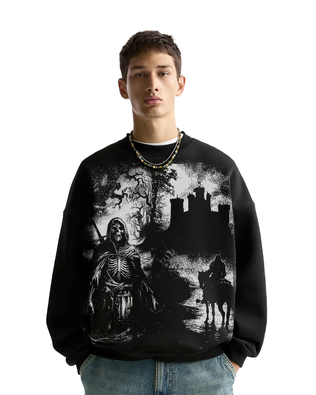 300 GSM Cotton Fleece Crewneck Drop Shoulders Boxy Oversized Fit Black Unique Colour Biowashed Combed Hypo-Allergic Fabric GOTS Organic Cotton Certified EVOLUTION RAGE STUDIOS Proudly Made in India. note the above product is artisan stitched and screen printed, crafted by human hands, not machines