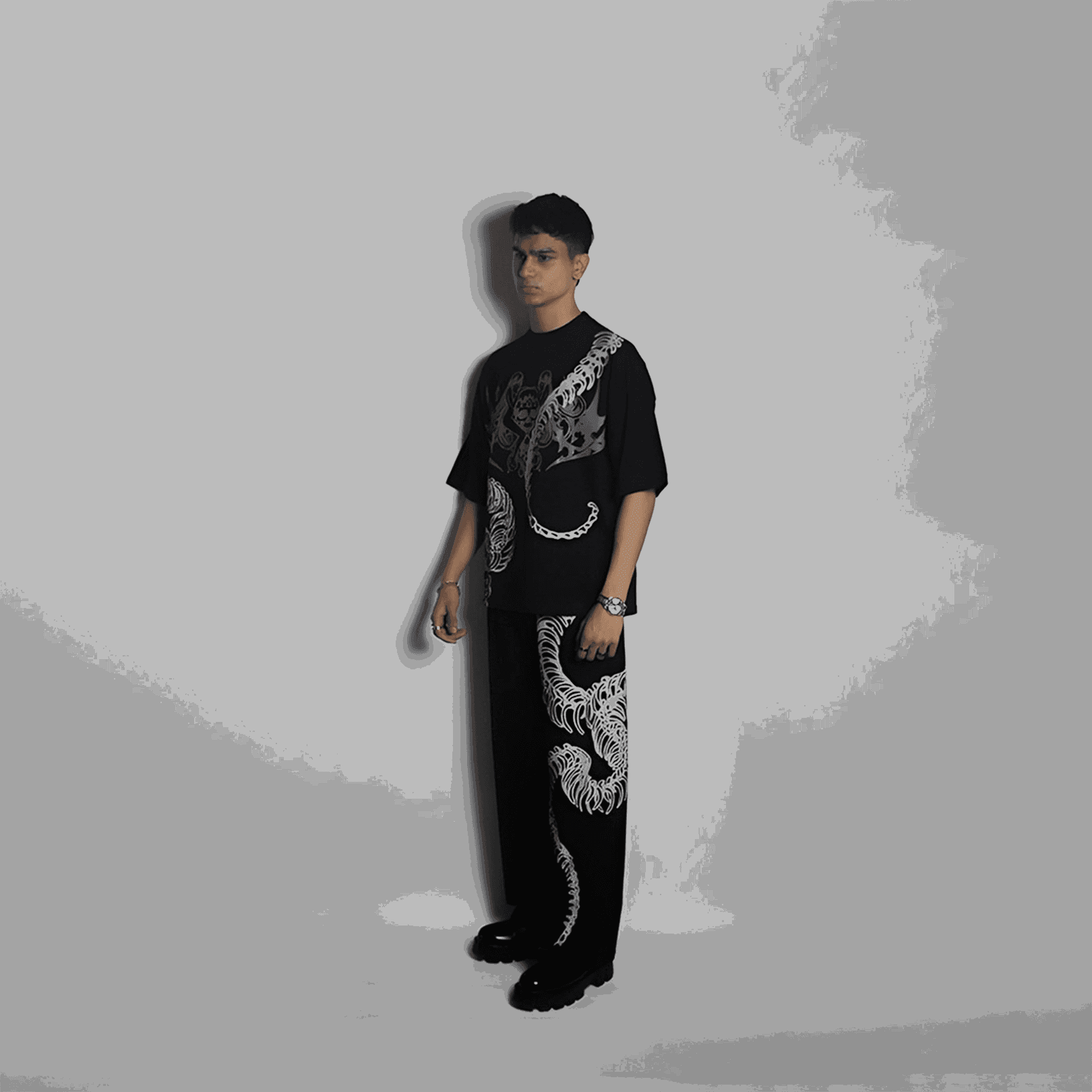 250 GSM Cotton Terry Crewneck Drop Shoulders Boxy Oversized Fit Jet Black Unique Colour Biowashed Combed Hypo-Allergic Fabric GOTS Organic Cotton Certified KOTSU RAGE STUDIOS Proudly Made in India. note the above product is artisan stitched and screen printed, crafted by human hands, not machines