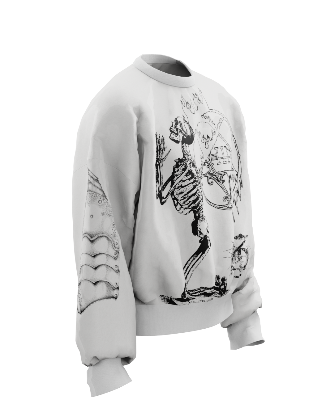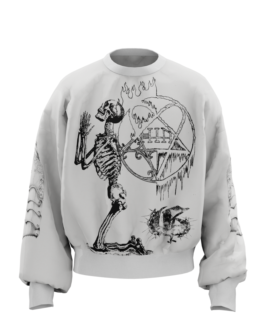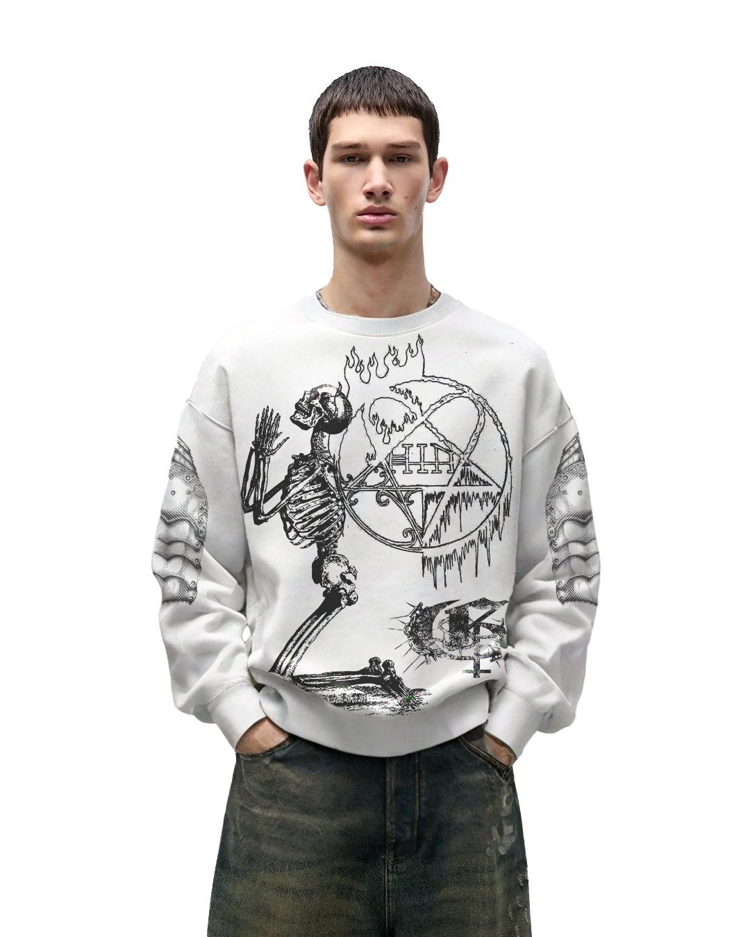 300 GSM Cotton Fleece Crewneck Drop Shoulders Boxy Oversized Fit White Unique Colour Biowashed Combed Hypo-Allergic Fabric GOTS Organic Cotton Certified PENTAGRAM RAGE STUDIOS Proudly Made in India. note the above product is artisan stitched and screen printed, crafted by human hands, not machines